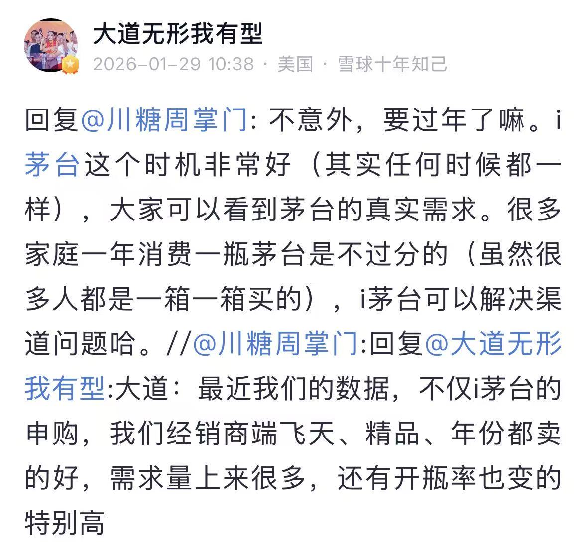 同在1月29日,段永平在社交平台回复网友提问时,进一步表达了对茅台的看好。针对网友提及的“最近我们的数据,不仅i茅台的申购,我们经销商端飞天、精品、年份都卖得好,需求量上来很多,还有开瓶率也变得特别高。”的情况,段永平表示“不意外,要过年了嘛”,并肯定了i茅台模式的价值,认为“i茅台这个时机非常好(其实任何时候都一样),大家可以看到茅台的真实需求。很多家庭一年消费一瓶茅台是不过分的(虽然很多人都是一箱一箱买的),i茅台可以解决渠道问题哈”。他还公开表示,当前贵州茅台的股价“真的不贵”,再次彰显了对茅台投资价值的认可。