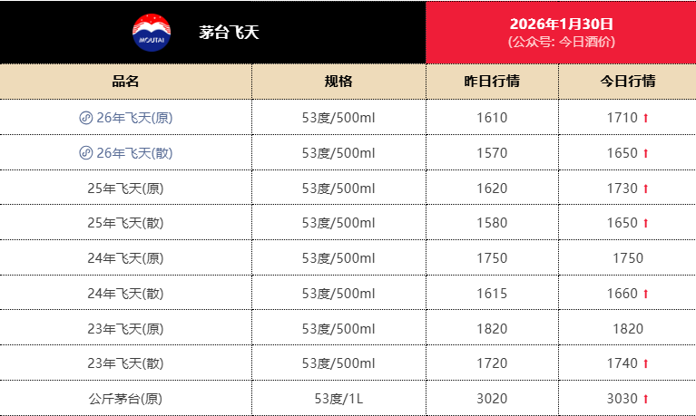 批发价方面。第三方平台“今日酒价”数据显示,1月30日,各年份飞天茅台(53度/500ml规格,下同)批发参考价迎来全面上涨,涨幅超出市场预期。具体来看,2026年飞天茅台原箱报1710元/瓶,较前一日大幅上涨100元,单日涨幅6.21%;散瓶报1650元/瓶,上涨80元,涨幅5.1%。2025年飞天茅台表现最为抢眼,原箱报1730元/瓶,较前一日暴涨110元,单日涨幅高达6.79%;散瓶报1650元/瓶,上涨70元,涨幅4.4%。