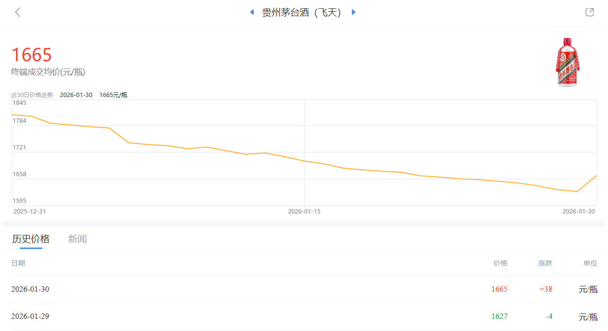 与批发价同步回暖的是终端零售市场。第三方平台“酒价内参”披露的数据显示,1月30日,飞天茅台终端零售均价为1665元/瓶,较前一日大涨38元,涨幅2.3%,创下1月21日以来的价格新高,扭转此前的下跌颓势。在此次反弹之前,飞天茅台终端零售均价曾经历了连续16天的持续下跌,市场情绪较为低迷,并在1月29日创下了1627元/瓶的阶段性新低。这一价格较2025年底的1808元/瓶累计跌幅超过10%,下跌速度和幅度均超出市场预期,引发行业广泛关注。