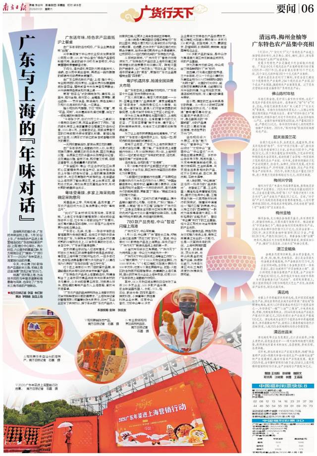 连续两天的推介会,广东把年味送到上海。1月30日上午,广东特色农产品进上海营销活动在广东名特优新农产品(上海)推介中心举办。两小时后,六公里外的黄浦江畔,东方明珠见证了“媒体+”广货行天下——2026广东年菜进上海营销行动的开幕。
