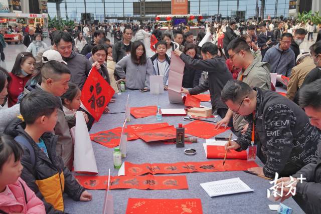 春运首日的广州南站热热闹闹又忙中有序,书法家们现场挥毫,为旅客免费书写春联、赠送福字,不少旅客手捧着墨香四溢的春联笑意盈盈出发,候车大厅里洋溢着喜庆祥和的节日氛围。当天,车站到发旅客53万人次,同比去年春运首日增长19%。