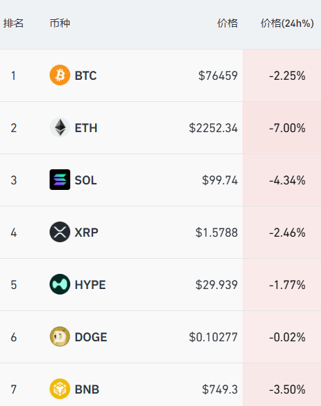 加密货币主要币种持续下挫。Coinglass数据显示,截至北京时间2月2日7:10左右,比特币跌破77000美元关口,报76459美元/枚。过去24小时,全市场超16万人被爆仓。