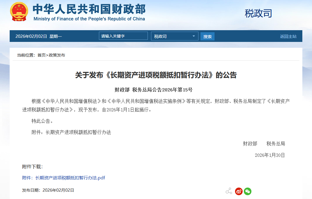 财政部发布《长期资产进项税额抵扣暂行办法》