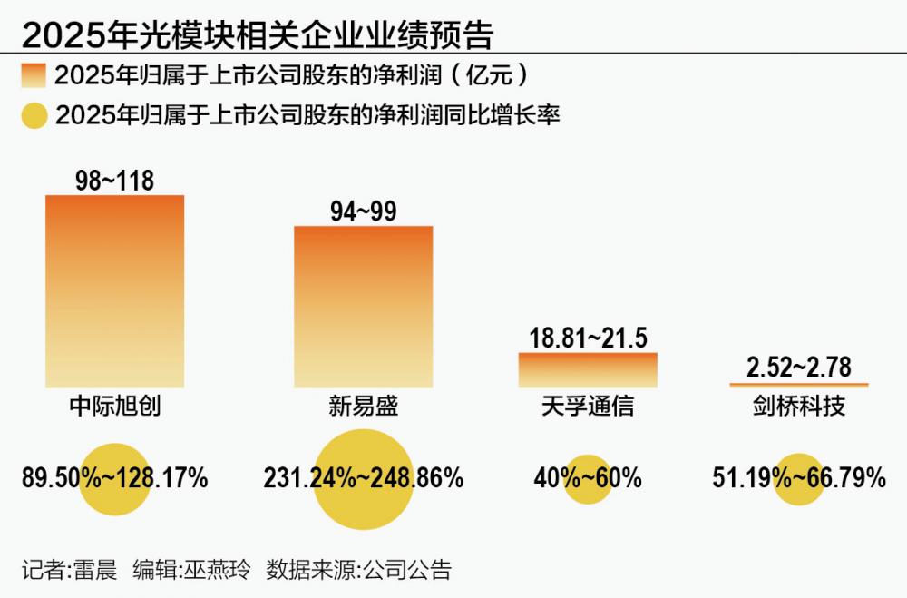 近期,多家光模块龙头企业发布了2025年的业绩预告。数据显示,相关公司的净利润出现了大幅增长。其中,中际旭创和新易盛的表现尤为突出。