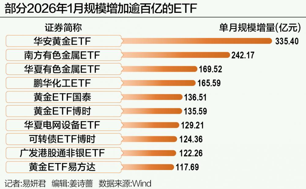 Wind数据显示,2026年1月,有色金属、化工、电网设备、卫星、半导体设备、科创芯片等多只行业主题ETF的规模增加了100亿元以上。同时,商品型黄金ETF、港股ETF亦加速扩容。