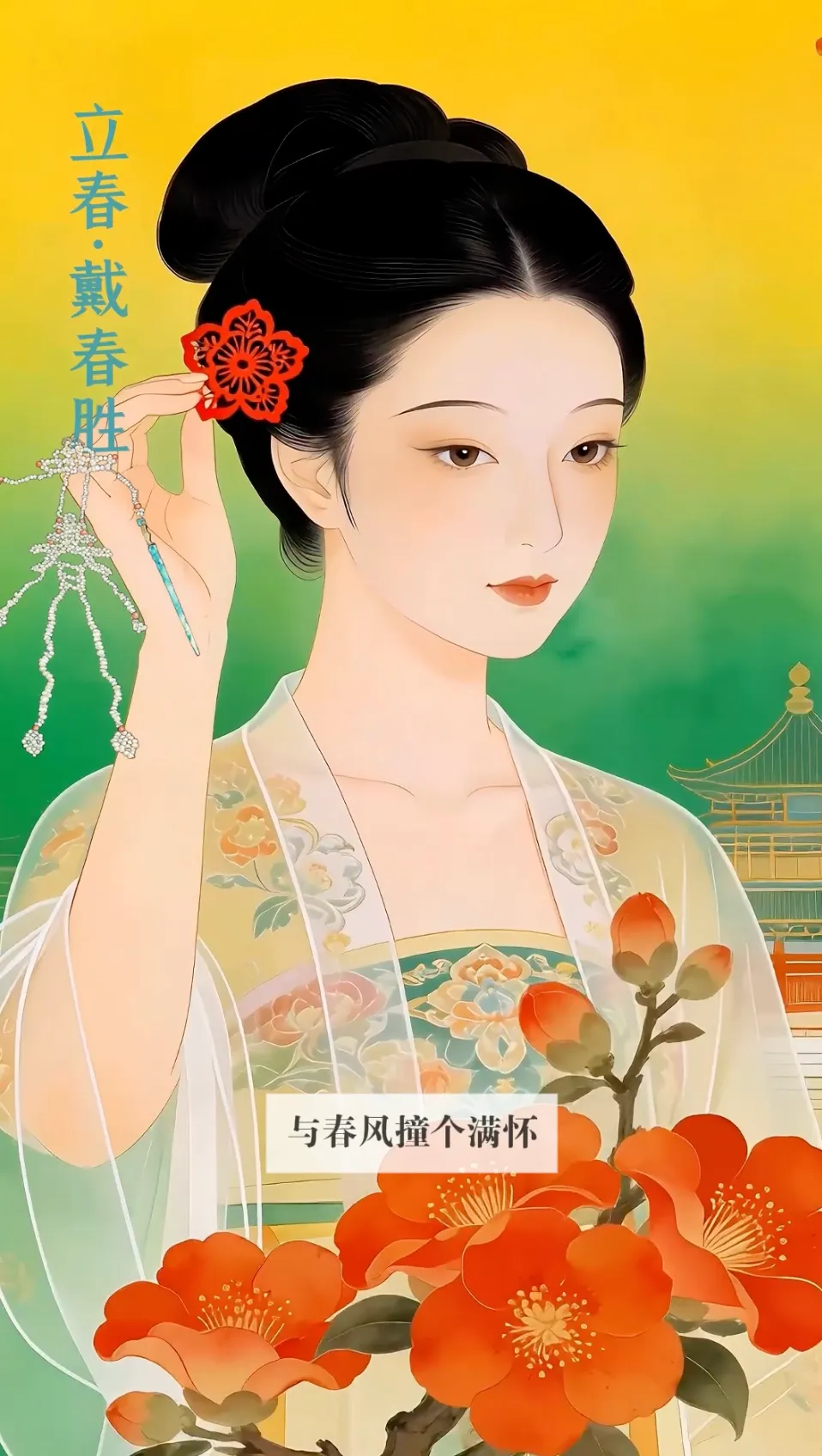 妇女用彩纸、绢帛剪出春燕花鸟簪在头上