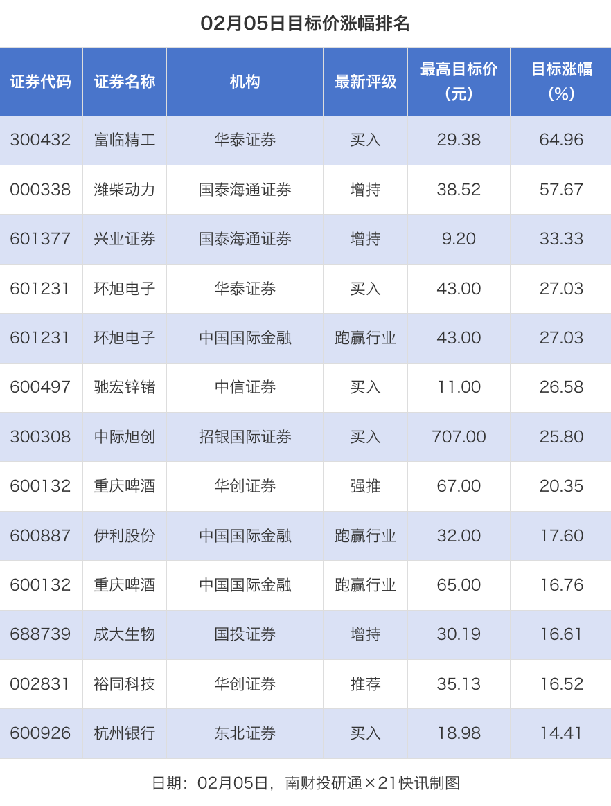 南财投研通数据显示,2月5日,券商给予上市公司目标价共13次,按最新收盘价计算,目标价涨幅排名居前的公司有富临精工、潍柴动力、兴业证券,目标价涨幅分别为64.96%、57.67%、33.33%,分别属于电池、汽车零部件、证券行业。