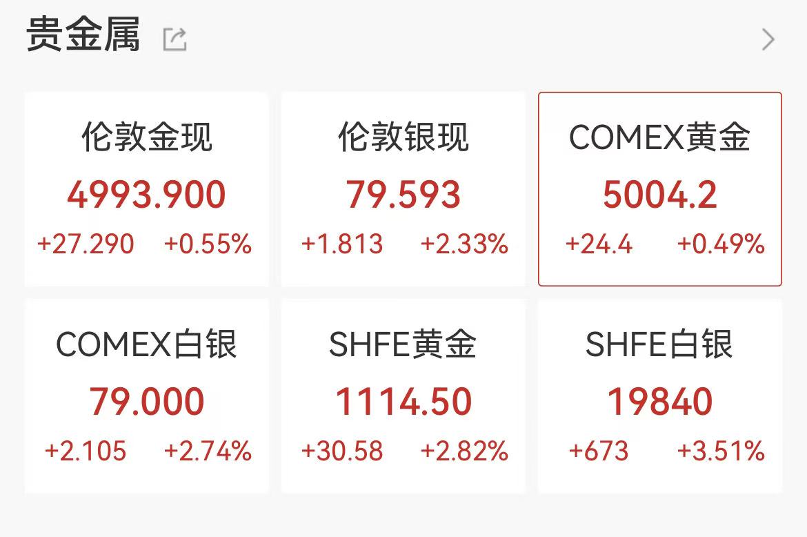 现货白银日内涨超2%,报79.59美元/盎司。现货黄金逼近5000美元/盎司。