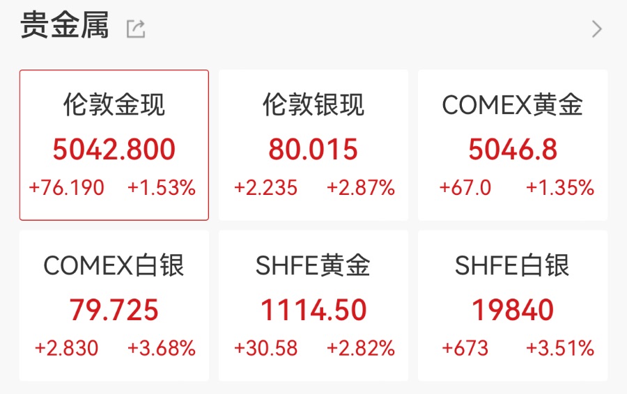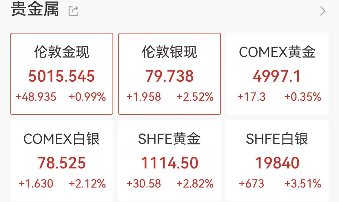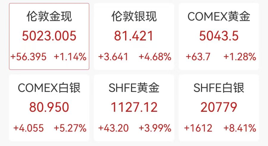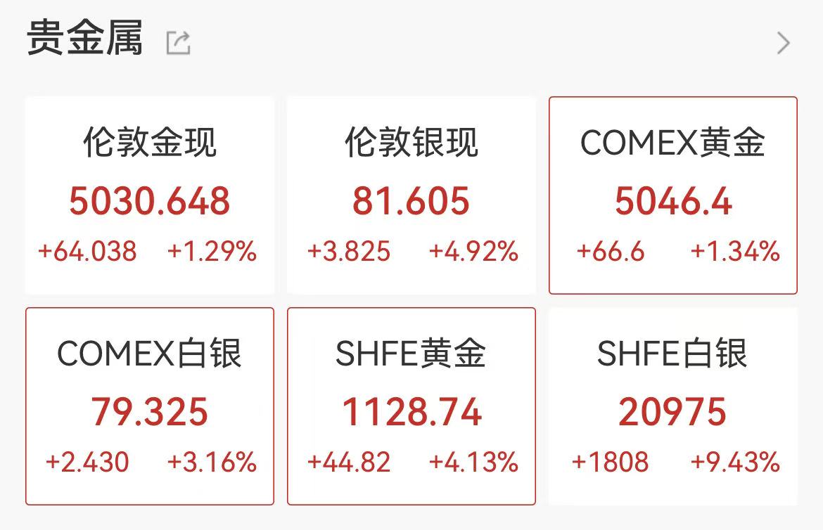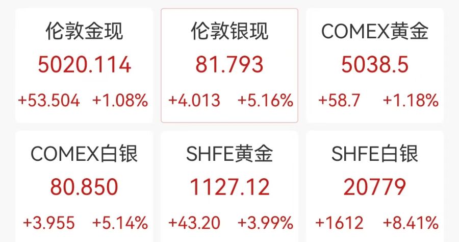 截至目前,现货黄金涨1.08%,报5020.114美元/盎司;现货白银涨5.16%,报81.793美元/盎司,盘中一度触及82美元/盎司。