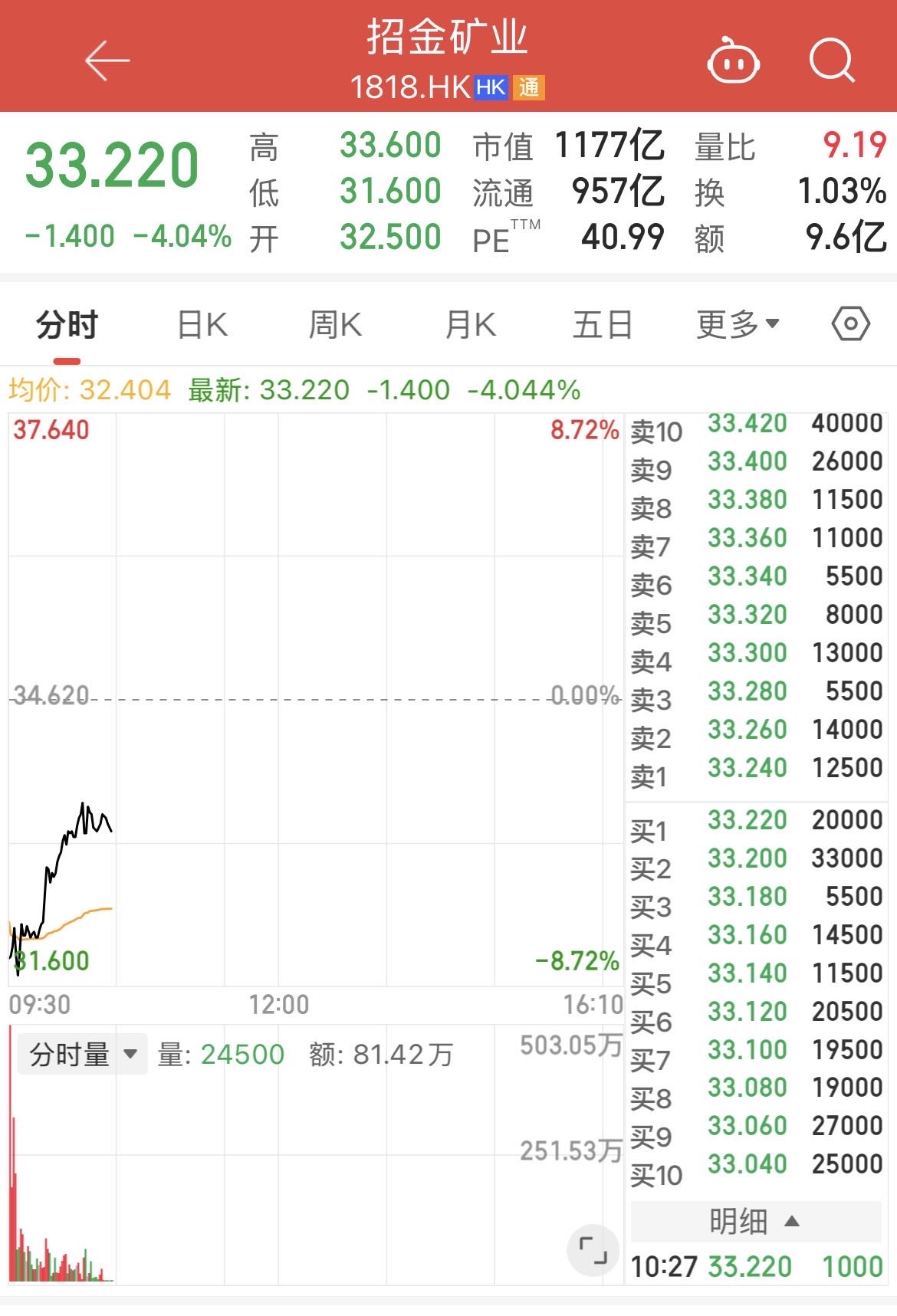 2月10日,招金矿业(1818.HK)开盘跌超8%,截至10时27分报33.22港元/股,跌幅达4.04%。
