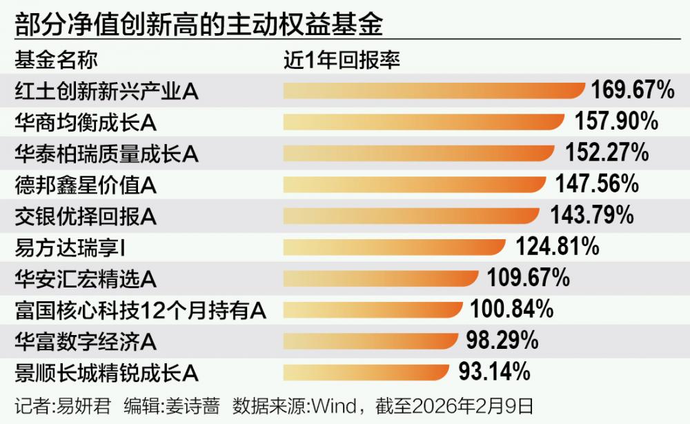 Wind数据显示,截至2026年2月9日,共有149只主动权益基金的单位净值创成立以来新高。这些基金在投资风格上呈现分化:部分产品集中配置AI算力、应用等赛道,业绩弹性突出但波动较大;另一些产品更注重分散配置以控制风险。
