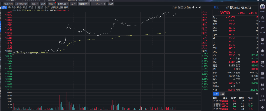 沪镍期货主力合约涨超4%,报139720元/吨。