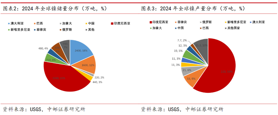 中邮证券表示,镍供给:印尼戏份不断增强。储量来看,印尼镍储量5500万吨,全球占比42%,是全球最重要的镍储量国,巴西和澳大利亚储量分别为1600万吨和2400万吨,占比分别为12%和18%。年产量来看,2024年全球镍产量为352万吨,YOY为4.7%,2025年,根据INSG预测,全球年产量为381万吨,YOY为8.2%。印尼方面,2024年印尼镍产量220万吨,全球占比60%左右,且随着25年其产量的进一步释放,占比为67%,对全球镍供应具有举足轻重的作用。