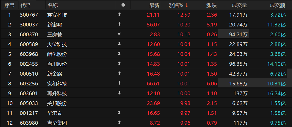 基础化工板块强势,震安科技、新宙邦张超10%,三房巷、大位科技、醋化股份、百川股份、新金路、宏和科技、再生科技、美邦股份、华尔泰等涨停。
