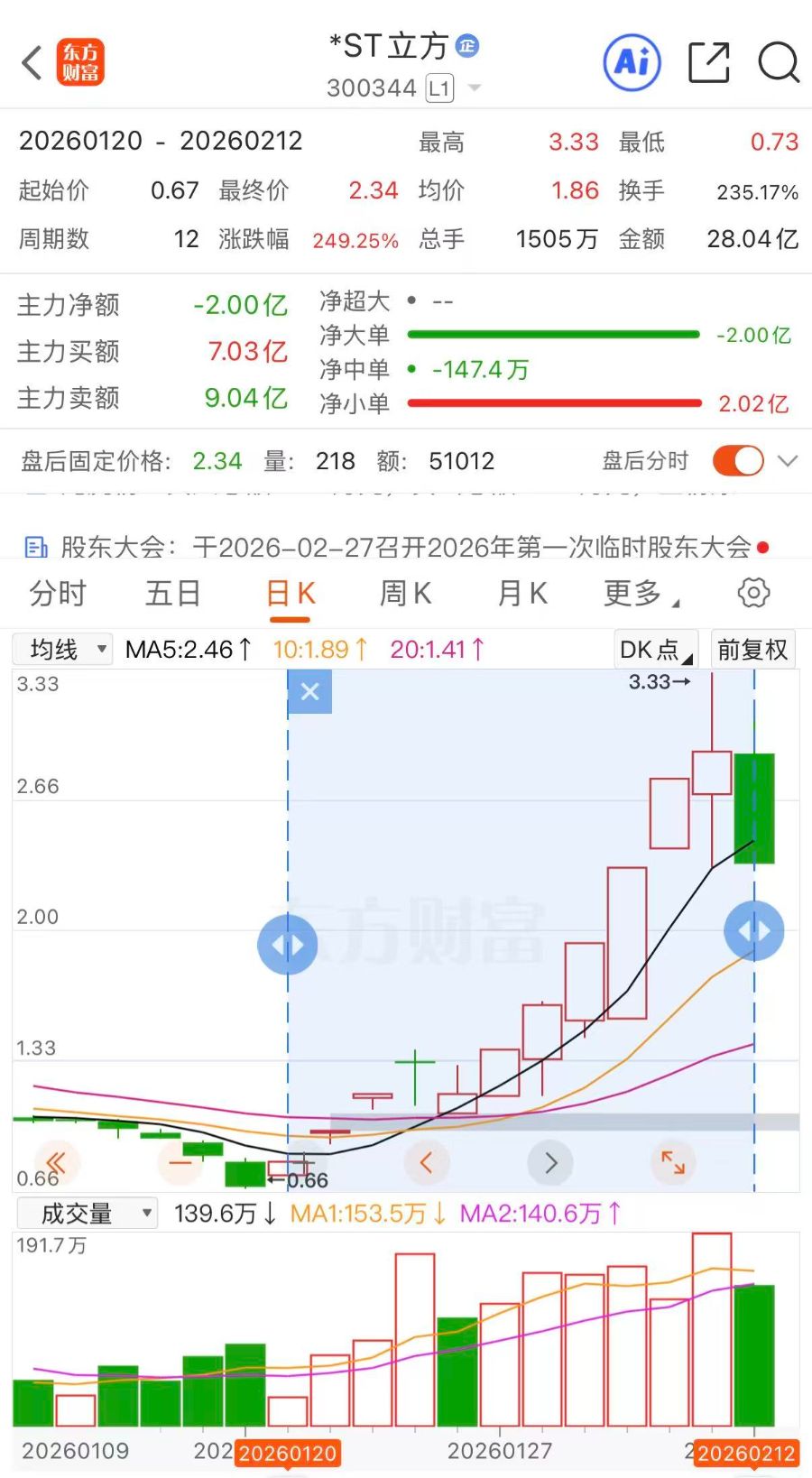 “疯狂”的ST立方(300344.SZ)终究被按下了“暂停键”。2月12日,公司股价遭遇“20CM”一字跌停,收报2.34元,封单逾10万手。就在前一日复牌时,该股还一度触及“20CM”涨停摸高至3.33元。而在此之前的11个交易日内,ST立方最高累计涨幅一度冲至397.01%。