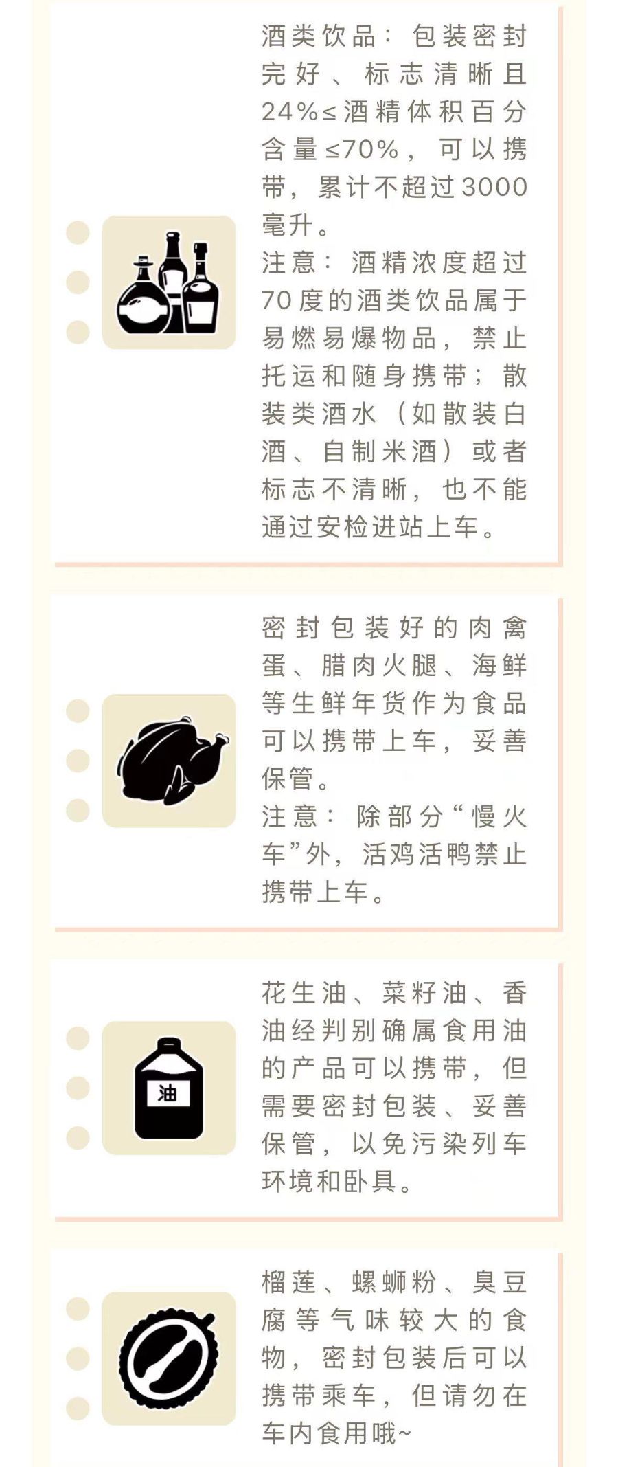 经过一个春节假期,返程的行囊里是不是多了许多沉甸甸的“爱”?但是千万注意乘坐火车返程时,有些物品可以随身携带,但有限量要求,需要明确的标志和定量,而有些物品是不能携带和托运的。