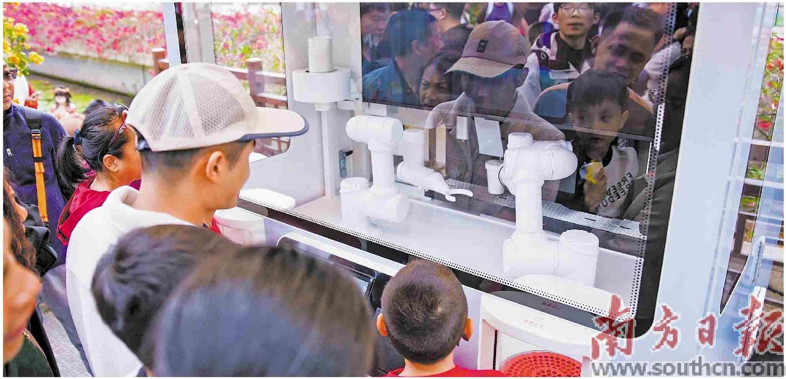 春节假期,深圳甘坑古镇AI黑科技带来连连惊喜。图为机器人制作咖啡吸引游客体验。南方日报记者 朱洪波 通讯员 张静雅 摄