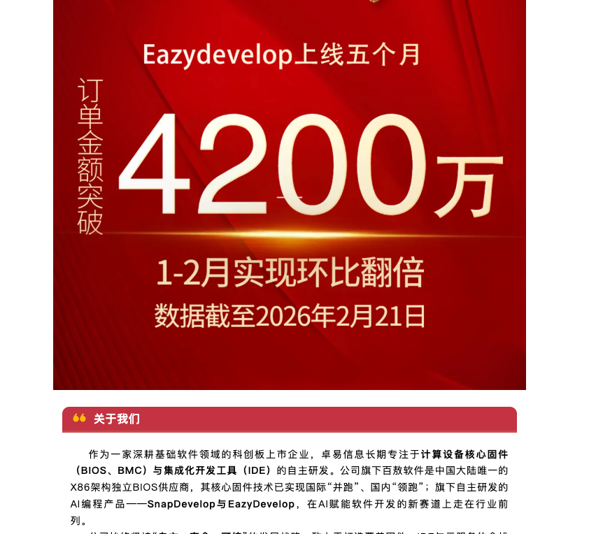 近日,卓易信息在官方微信公众号披露,截至今年2月21日,EasyDevelop产品订单突破4200万元,其中2026年1-2月订单金额实现环比翻倍。