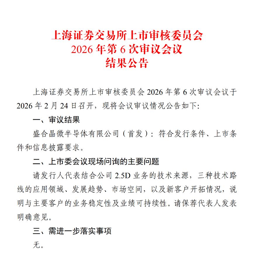 2月24日晚间,上交所官网显示,盛合晶微半导体有限公司(简称“盛合晶微)IPO申请获得科创板上市委审核通过。其是春节假期后首个交易日唯一一家参加科创板“面试”的公司,也是马年A股首家过会的IPO企业。