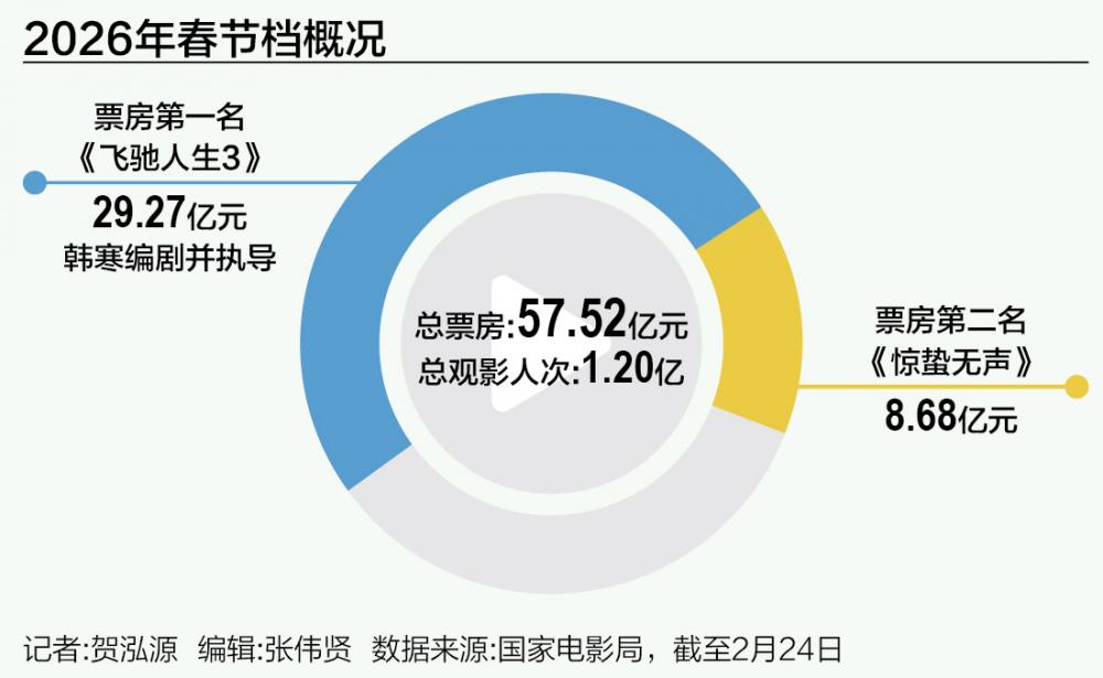 2月24日,据国家电影局数据,2026年春节档票房为57.52亿元,观影人次为1.20亿。其中,韩寒编剧并执导的《飞驰人生3》以29.27亿元票房位居档期冠军,远远超出第二名《惊蛰无声》的8.68亿元票房成绩。
