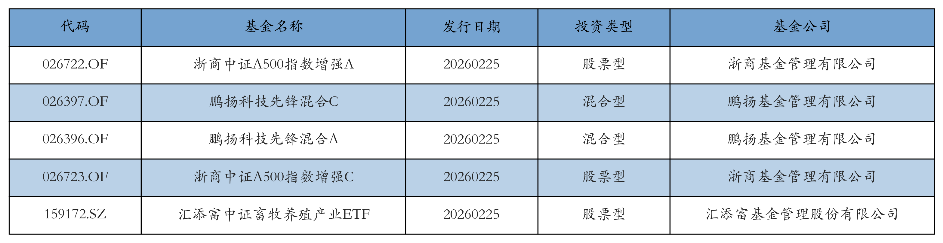 昨日有5只新基金发行,分别为:浙商中证A500指数增强A、鹏扬科技先锋混合C、鹏扬科技先锋混合A、浙商中证A500指数增强C、汇添富中证畜牧养殖产业ETF,详情见下表: