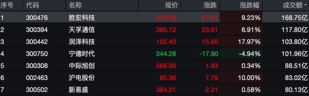 沪深两市半日成交额1.64万亿,较上个交易日放量1173亿。个股方面,胜宏科技半日成交额超168亿元居首,天孚通信、润泽科技、宁德时代等成交额均在100亿元以上。