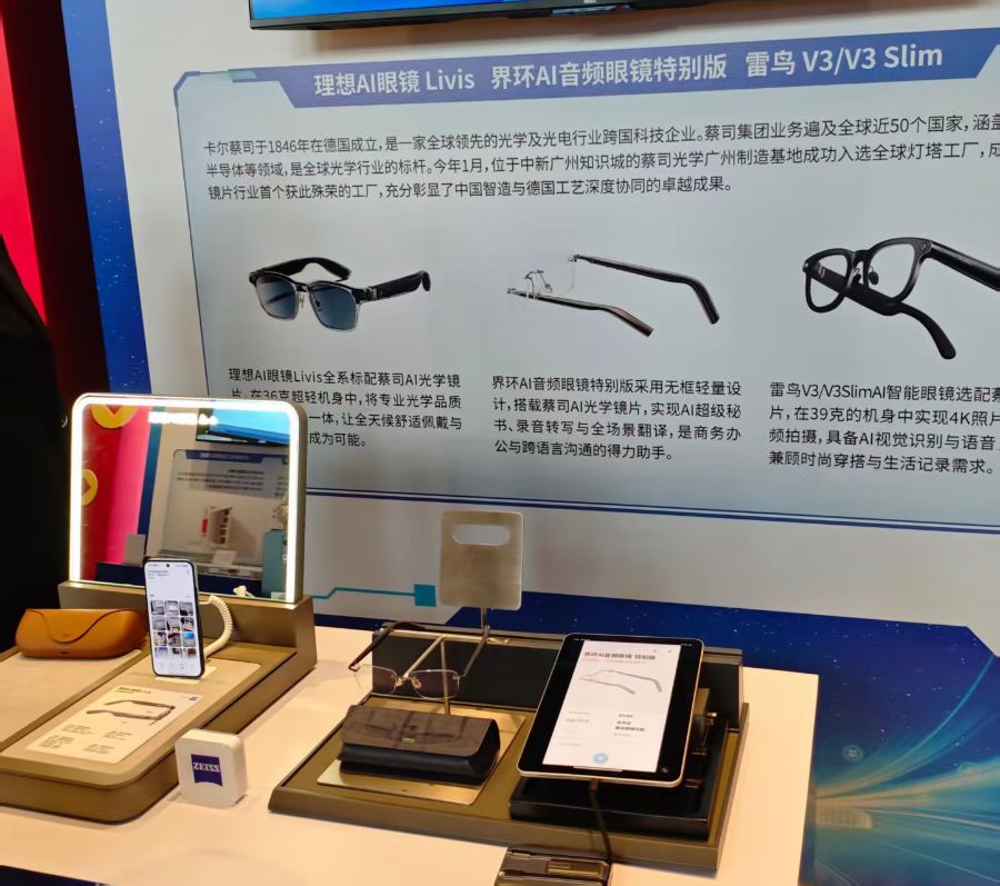记者了解到,蔡司光学镜片正在成为众多智能眼镜品牌的合作首选,理想AI眼镜Livis、雷鸟RayNeoV3、界环AI音频眼镜钛无框款等多款热门产品均采用蔡司光学解决方案。本次大会的蔡司展区也吸引了大量参会嘉宾驻足体验。