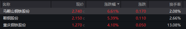 钢铁板块大涨,马鞍山钢铁涨6.6%,鞍钢股份涨超5%。