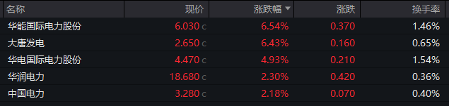 电力板块涨幅居前,华能国际电力股份、大唐发电均涨超6%。