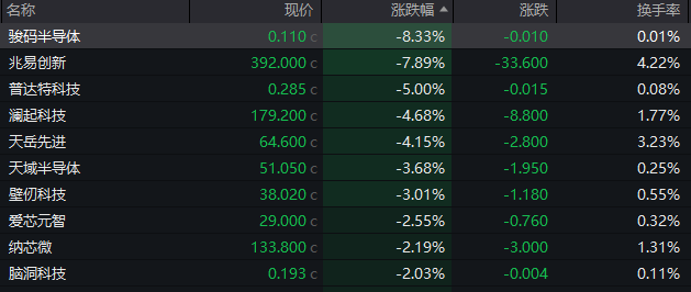 半导体板块走弱,骏码半导体跌超8%,兆易创新跌超7%。