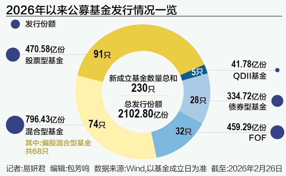 Wind数据显示,以基金成立日为准,截至2月26日,在2026年前两个月成立的新基金数量达到230只,发行规模合计2102.80亿元。至此,于年内成立的新基金数量及发行规模均同比增长逾41%。