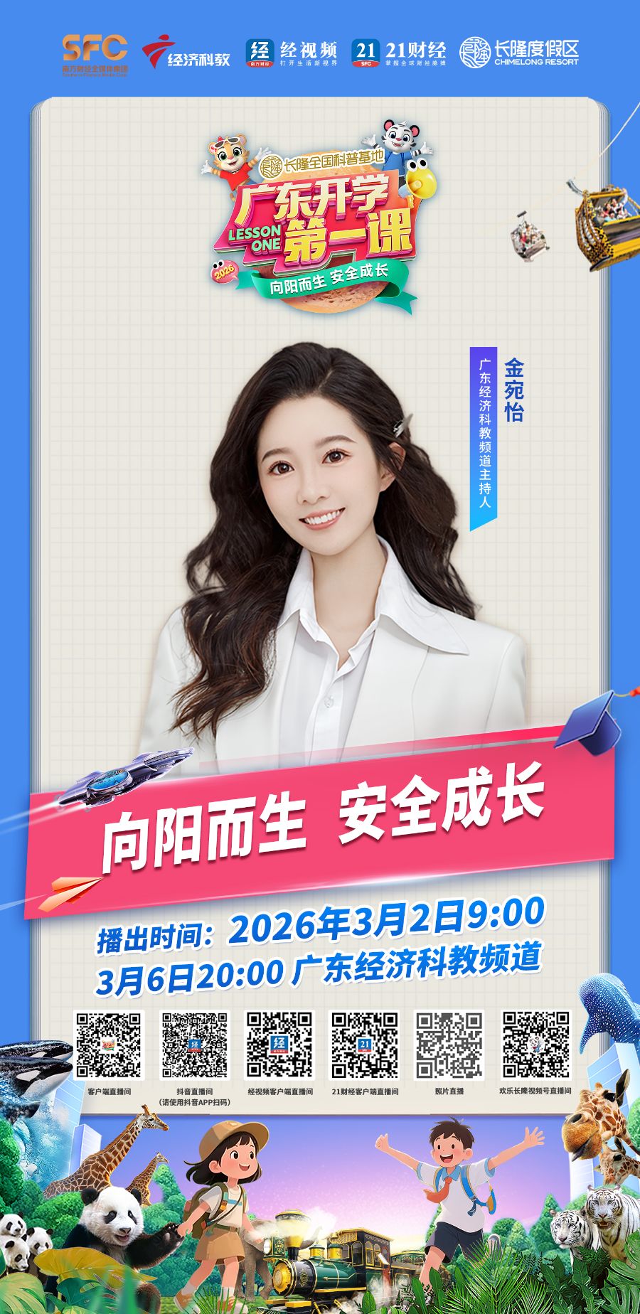 3月2日9:00,锁定广东开学第一课官方直播间经视频APP、21财经APP、广东经视抖音号、微博、微信视频号(经视频)、欢乐长隆视频号,与全省师生一起,向阳而生,安全成长!
