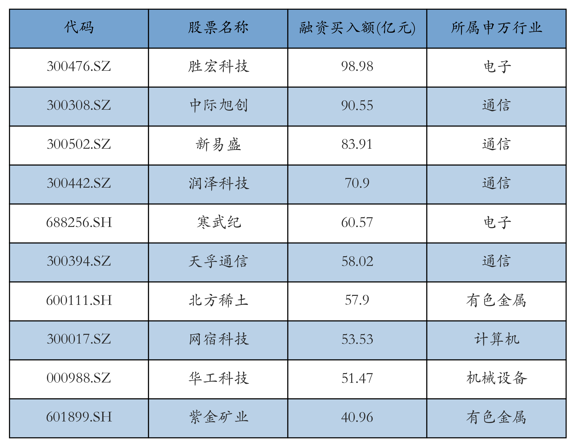 上周两市共有3487只个股有融资资金买入,共有172只个股买入金额超10亿元,其中胜宏科技、中际旭创、新易盛排名前三,买入金额分别98.98亿元、90.55亿元、83.91亿元。融资买入额前10个股详情见下表: