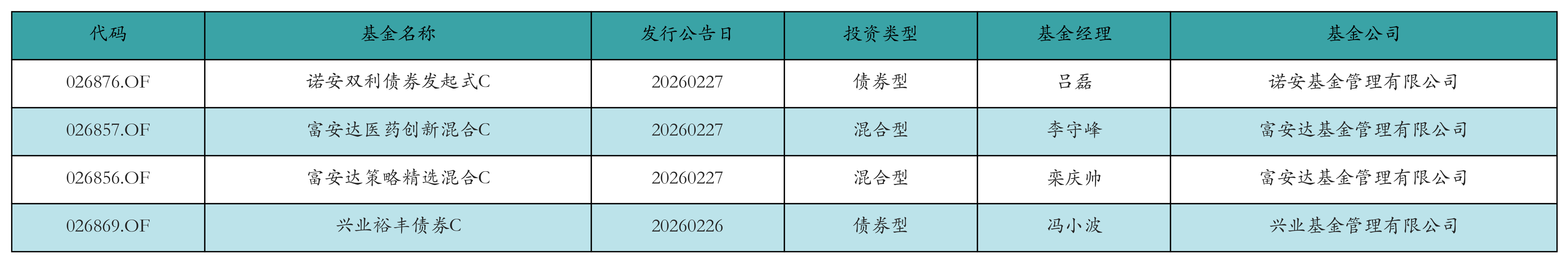 上周有4只新基金发行,分别为:诺安双利债券发起式C、富安达医药创新混合C、富安达策略精选混合C、兴业裕丰债券C,详情见下表: