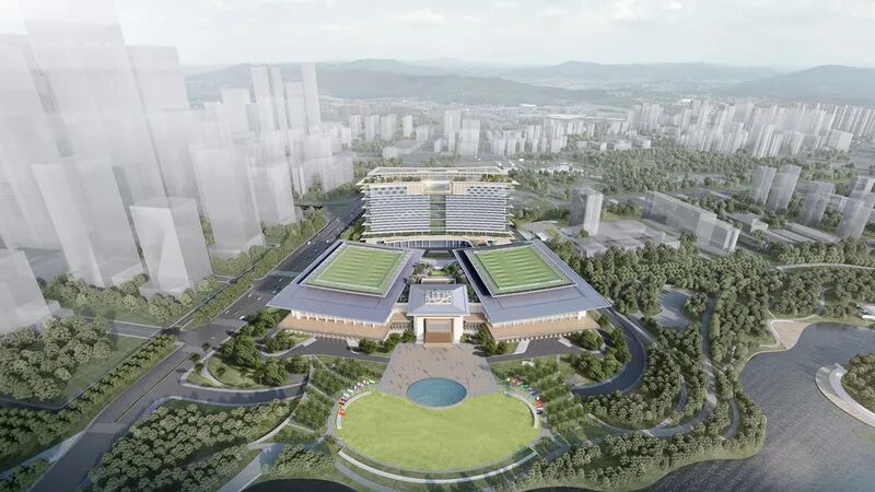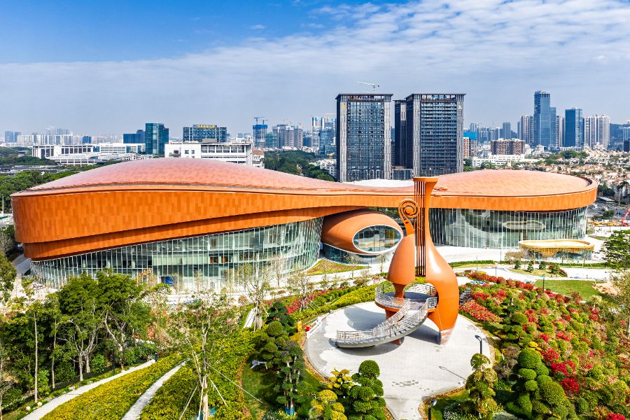 今年1月底,深圳市市级重大文体设施——深圳龙岗国际艺术中心正式向公众开放,总建筑面积11万平方米,建筑设计取琵琶、排箫、小提琴等中西古典乐器之形,内含国际演艺中心、数字展览中心、东广场及山花烂漫公园四大板块,定位为“大湾区智慧文化场馆标杆”。