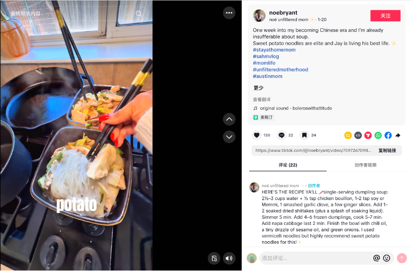 随着日常生活方式的讨论和交流逐渐深入,有的外国网友开始尝试中式烹饪。有博主分享自己做的粉丝汤,食材包括粉丝、饺子、青菜和香菇,还特意用中国品牌的老抽调色,并在评论区附上完整食谱。也有人挑战西红柿鸡蛋汤,用圣女果和鸡蛋,搭配简单调料,还原家常味。