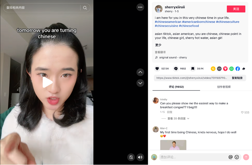 这条视频在TikTok迅速发酵,收获超过50万次点赞和近万条评论。一石激起千层浪,越来越多的海外博主、华裔内容创作者乃至国内网友加入这场讨论:有人模仿,有人科普,也有人玩梗。而在全民参与的互动下,话题热度也不断攀升。