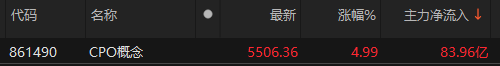 资金流向方面,CPO概念截至发稿获主力资金净流入83.96亿元。