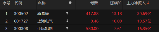 个股方面,CPO龙头新易盛获主力资金净流入近31亿元,中际旭创获主力资金净流入超16亿元。