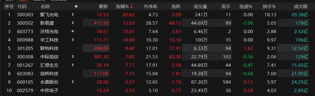 CPO概念持续走强,聚飞光电“20cm”涨停,新易盛涨超13%,沃格光电、华工科技涨停。