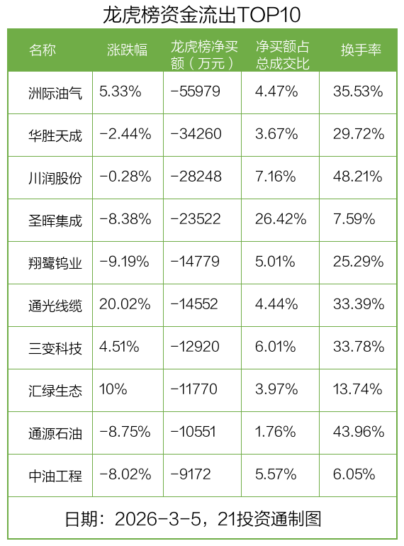 而龙虎榜中资金净流出最多的是洲际油气(600759.SH),被净卖出为5.6亿元,占总成交金额的4.47%。洲际油气收盘上涨5.33%,换手率为35.53%。