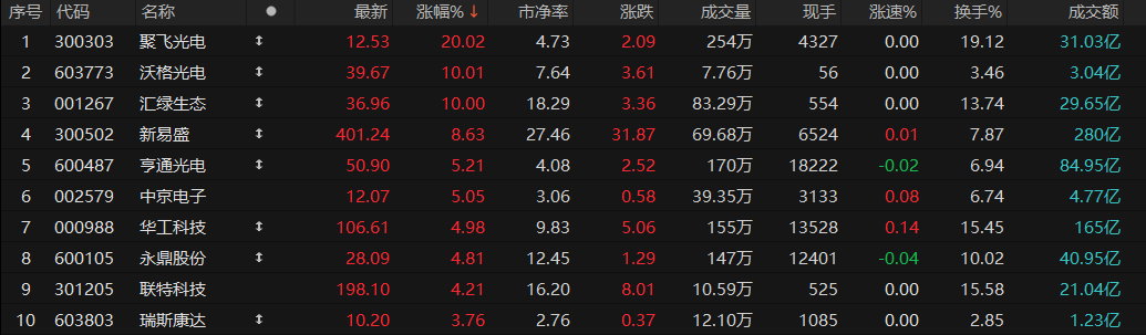 聚飞光电“20cm”涨停,沃格光电、汇绿生态涨停。