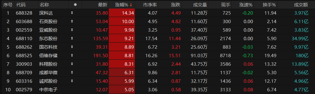 深科达涨超10%,石英股份、亚威股份涨停,东芯股份、国芯科技、佰维存储等涨超8%。
