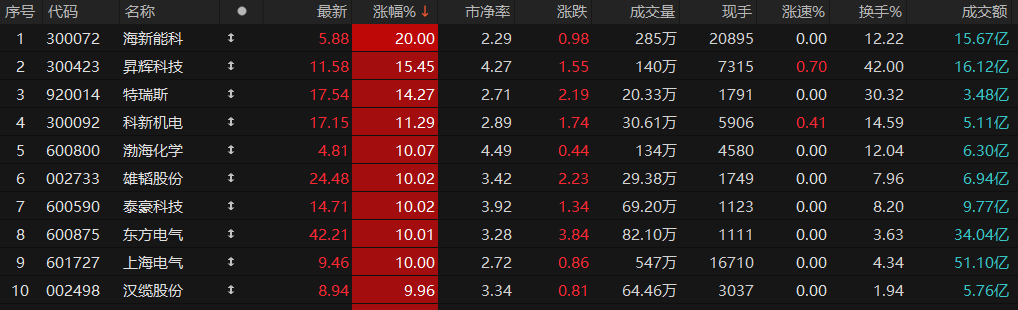海新能科“20cm”涨停,渤海化学、雄韬股份、泰豪科技、东方电气、上海电气等涨停。