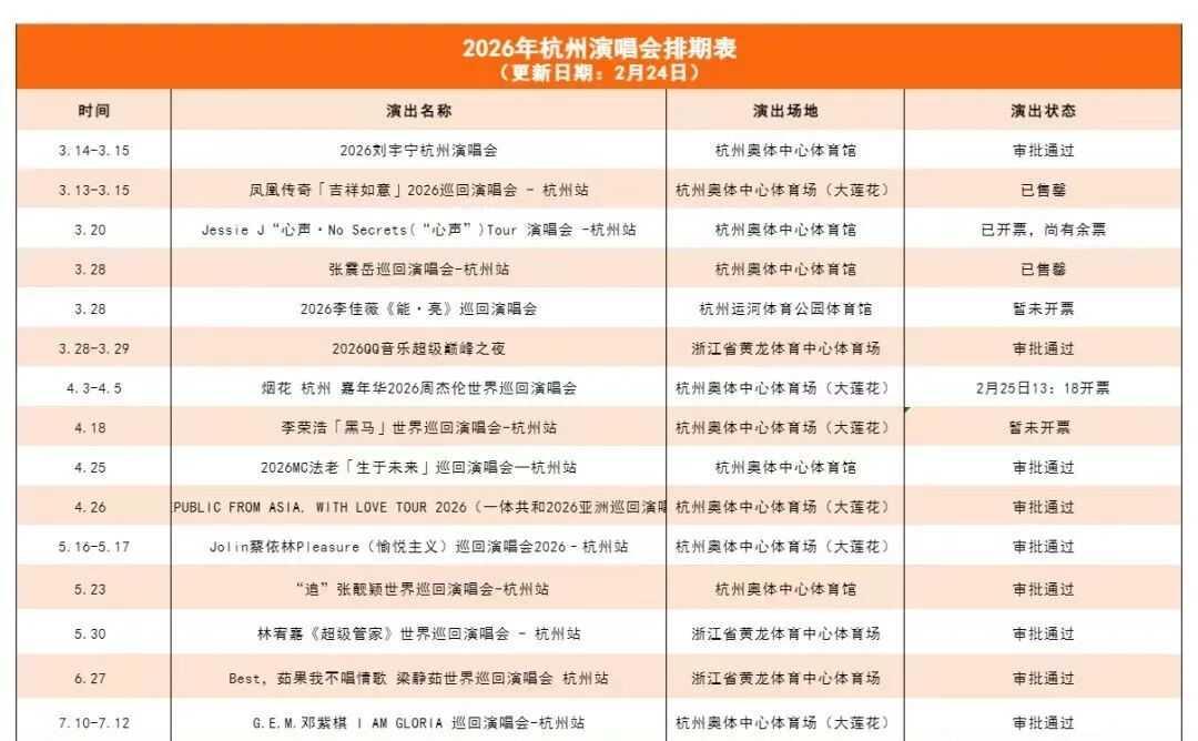 仅杭州目前就有刘宇宁、凤凰传奇、Jessie J、张震岳、李佳薇、李荣浩、MC法老、一体共和、蔡依林、张靓颖、林宥嘉、梁静茹、邓紫棋等艺人演唱会蓄势待发。