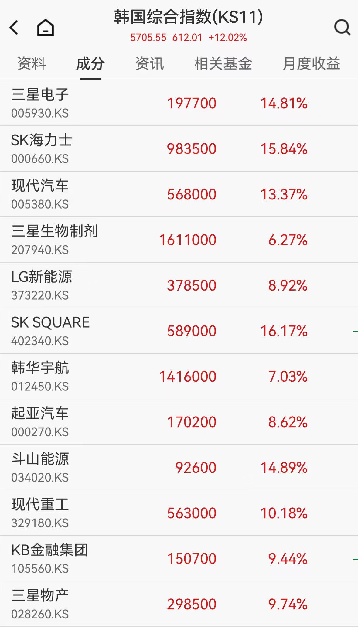 个股方面呈现普涨态势,三星电子、SK海力士、现代汽车等权重股涨幅均超过10%,市场情绪显著回暖。