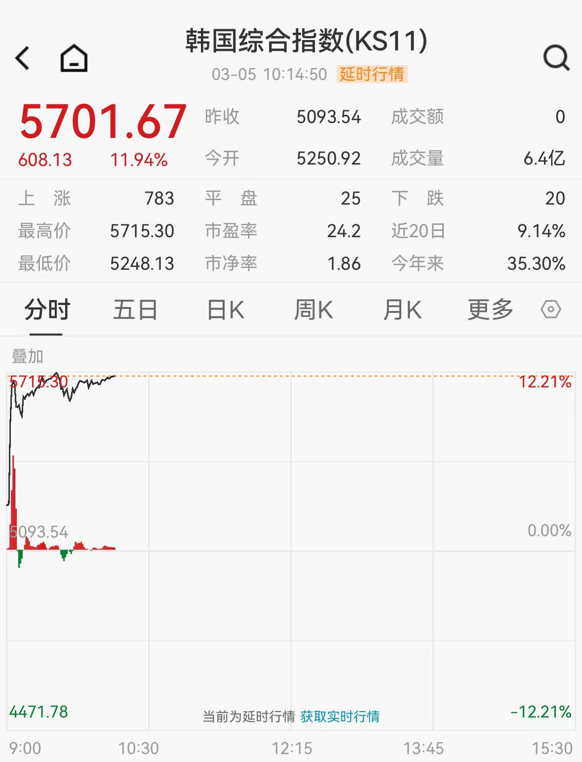 在经历了两天的暴跌熔断后,3月5日,韩国市场直线拉升,韩国综合指数开盘涨至11%,再次触发熔断机制,程序化交易暂停5分钟。