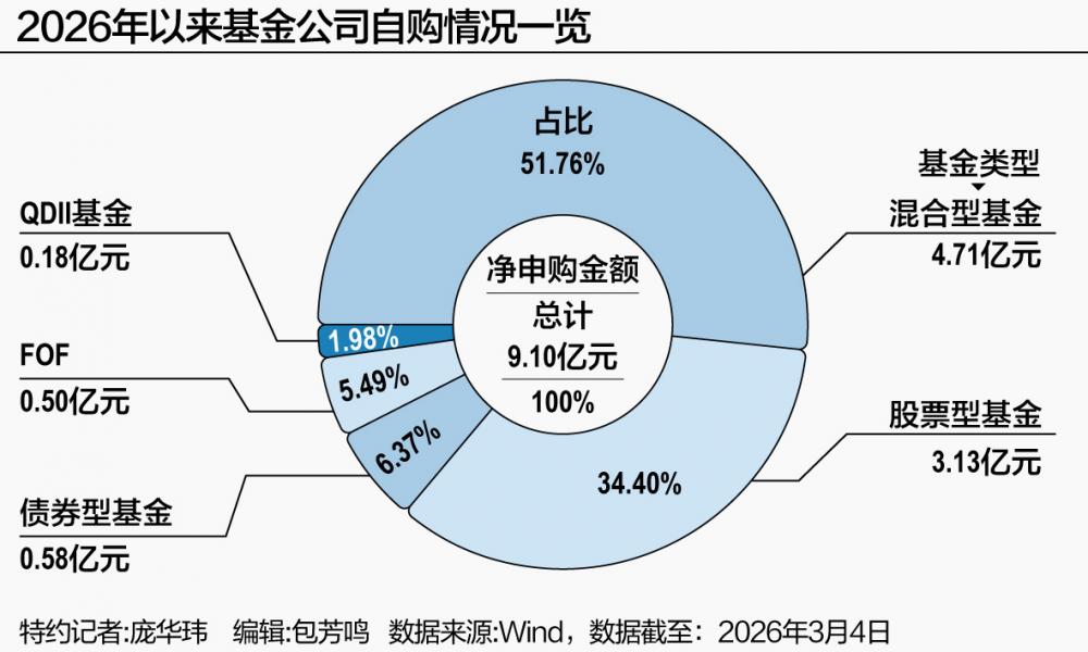 Wind数据显示,截至3月4日,2026年以来已有42家基金公司启动了自购,合计掏出9.1亿元“真金白银”。