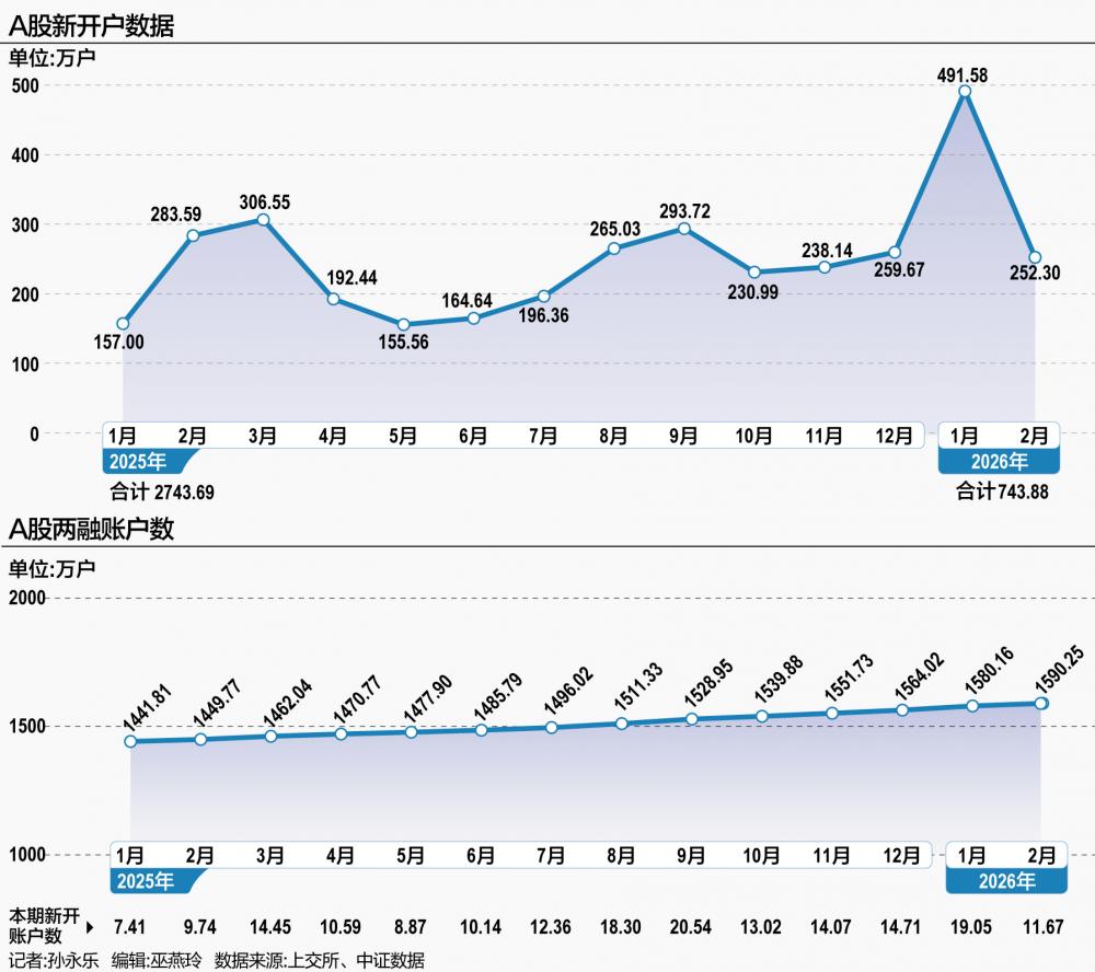 上交所最新数据显示,2月A股新开户数达252.3万户,同比2025年2月的283.59万户下降11%,环比今年1月的491.58万户下降49%。