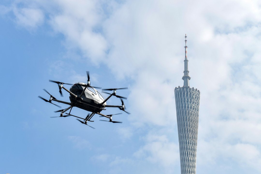 亿航载人无人机在海心沙上空飞行。
